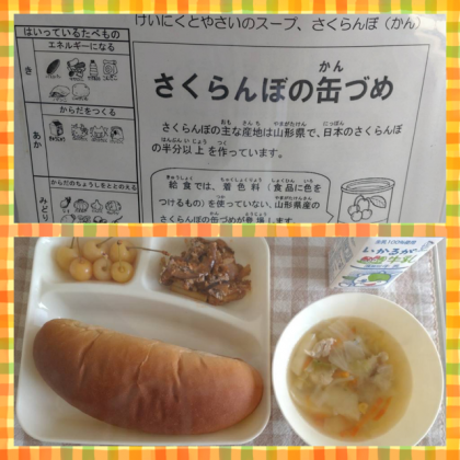 さくらんぼが出ました!!国産のさくらんぼは、とってもお高くてスーパーでもなかなか手が出ません…給食に出てくる缶詰のさくらんぼは、無着色です。おいしかったです!!