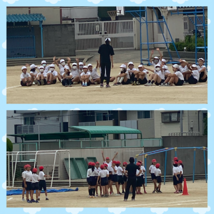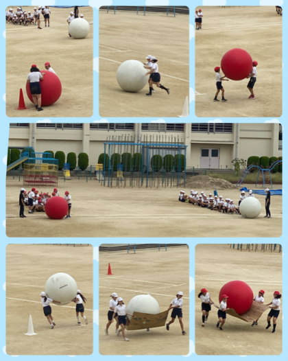 5年生は、団体競技で大玉運びをするそうです。コロナ禍になる前は、高学年の団体競技と言えば、棒ひきや騎馬戦でした。感染が少なくなってきたとは言え、まだまだ感染対策は継続。そこで、密にならずにできる競技ということで、大玉運びに挑戦です。
