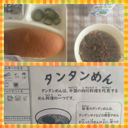 一気に寒さが増して秋が深まる今日は、タンタンめんです。肉みそがたっぷりめんにからんで、とってもおいしかったです。