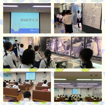 ここで撮った写真を新聞にして、お土産としていただけるそうです。その後、DVDを鑑賞してクイズに答えました。ほとんど全問正解の子どもたちばかりで、すばらしい!!