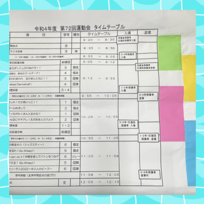 そして、写真の図は、当日運動会に来られるみなさんの動きがわかるように、チケットの色ごとにわかるようにした掲示物です。