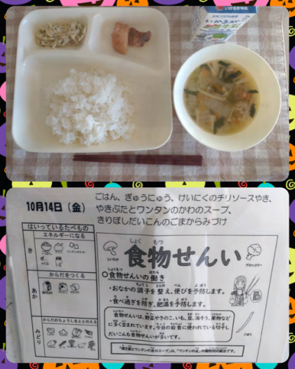 鶏肉のチリソース焼きは、少しスパイシーで食欲をそそります。運動会前日の今日、天気がいい中で最後の練習をしていた子どもたち、もりもり食べているでしょうね。