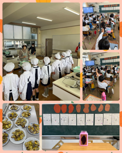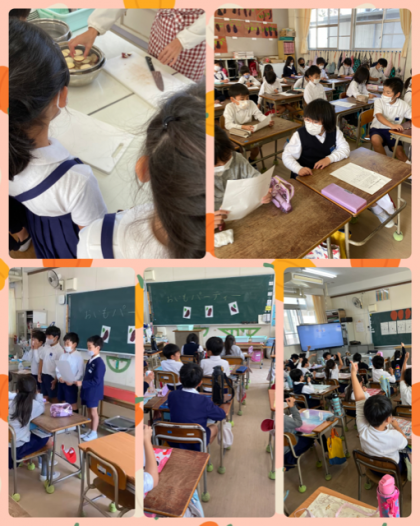 昨日の祝日の前日、担当の子どもたちとおいもを洗ったり、ざるやボールを準備しておいたそうです。今日は、朝から、家庭科室で、洗ってあったおいもをどんどん切って、温めたホットプレートで焼いていきます。うまく焼けたら、はちみつとバターをからめて、ハニーバタースイートポテトのできあがり(^O^)/