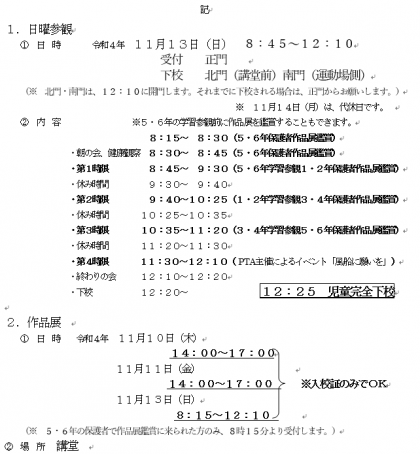 菊花の候、皆様方には益々ご健勝のこととお慶び申しあげます。平素は、本校教育推進のため何かとご理解ご協力をいただき、厚くお礼申しあげます。さて、先日ご案内しました作品展が明日より、また13日(日)には学習参観、PTA主催イベントも併せて行われます。何かとご予定もお立てのことと存じますが、子どもたちが一生懸命製作しました作品や学習の様子をぜひご覧いただきますよう改めてご案内申しあげます。