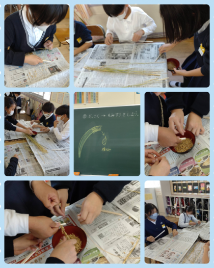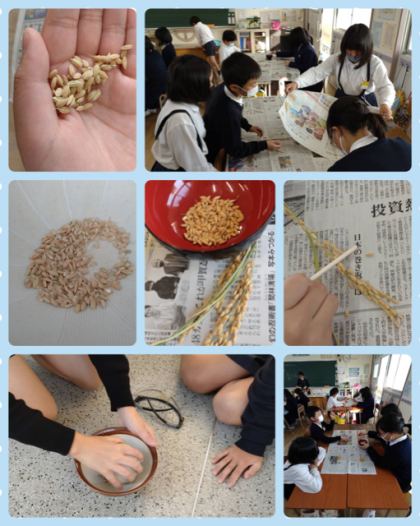 今日は、とれた稲の穂から、一粒ずつお米の粒をとる脱穀とそのお米が包まれているもみ殻をとるもみすりを行いました。