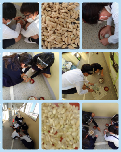 とれた粒を、すり鉢に入れ、なんと、ソフトボール投げで使ったボールでゴリゴリひたすらすっていきます。みんな、教室前の廊下でやってますね。(^O^)/