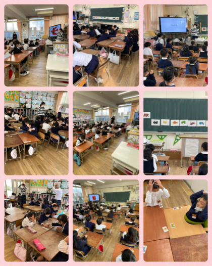 きれいな色の動物や虫のイラストを使って、ネイティブの先生の発音を聴いてまねて発音していきます。1年生は素直に大きな声で発音しています。さすがーーー!!