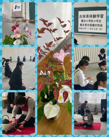 校長先生のご挨拶の後、前で代表の方がお茶をたててくださいます。流れるような動作でさじや茶筅やお茶碗の説明をしながら、お点前を披露してくださいました。
