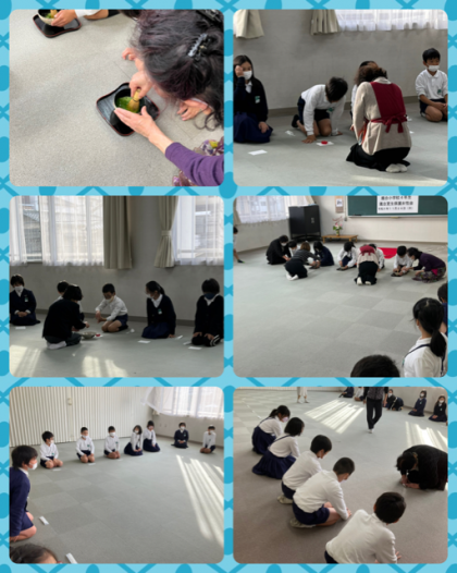 甘いお菓子の後は、たててくださったお茶をいただきます。お茶碗を手に持ったらまわして…みんな緊張しながらがんばっています。