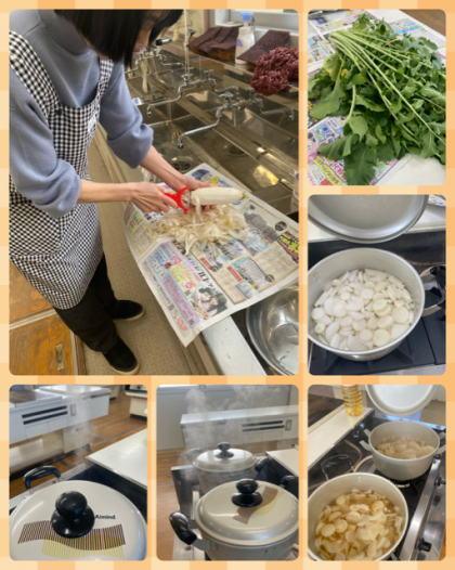 朝から、岩田先生と小林先生が皮をむいた大根を、「トントントン🎵」と包丁で切って、お鍋に入れ、炊いていきます。湯気があがっていますね。アクをとったら、おだしやみりんお砂糖に醤油で味付けし、たいていきます。大根にしみこんでいって、家庭科室の中は、いいにおい(^O^)/