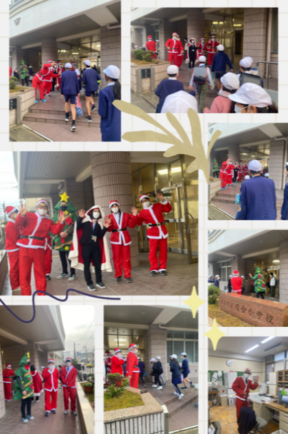 鷹合ならではの冬休み前の風景。サンタさんがいっぱい!!子どもたちもびっくりしながらもうれしそうな顔です。毎年、若い先生方が自主的にやってくださるんですよ。