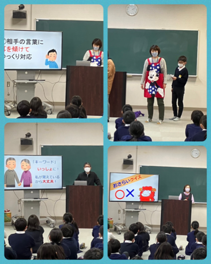 まずは、認知症について。認知症は、たくさんのことを忘れてしまう病気だけれど、楽しいことやうれしいことはわすれないし、心に残るんですって。子どもたち興味深く聞いています。