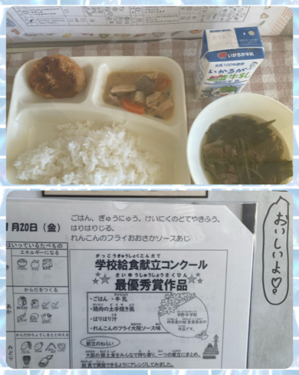 今日の献立は、学校給食献立コンクール最優秀賞作品だそうです。平野中学校の昨年度の給食委員会で考えた作品だそうです。