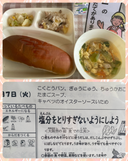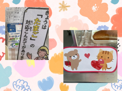 今日は、たまごスープということで、「たまご」の対応献立の日です。誤配を防ぐために。サンプルにもこのように、わかりやすく掲示をしてくださっています。中華おこわは、くりと焼き豚が入って、もちもちしてとってもおいしかったです。
