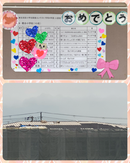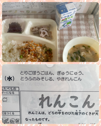今日は、まぜごはん。サンプルを見た給食当番さん、ガッツポーズをしています。想像通り、とってもおいしかったです。ごちそうさまでした。
