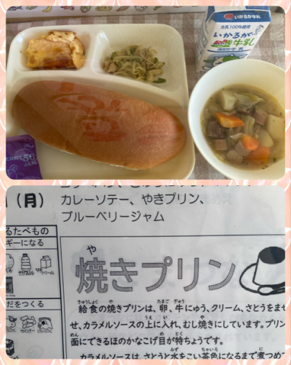 給食の焼きプリンは、卵に牛乳、クリーム、さとうを混ぜて、カラメルソースの上に入れて蒸し焼きにしているそうです。売っている物より、あまり甘くなくて、香ばしくて、ほんのりあったかーい手作りプリン、大好物なのですが…