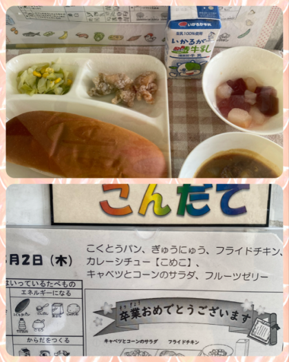 今日は、卒業祝い献立の日です。小学校の卒業式は、まだ少し先なのですが、中学校の卒業式が近く、今日に設定されているそうです。品数が多くて、びっくり!!しかも、みんな大好きなフライドチキン(^O^)/サンプルケースの前で、子どもたちが歓声を上げていました。