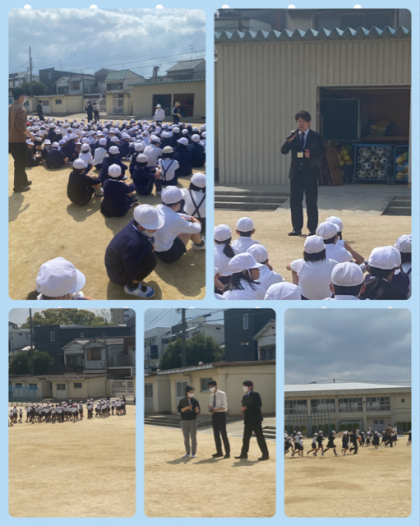 家庭科室から出火という想定で、訓練が始まりました。非常ベルが鳴って、緊急放送🔔、そして、運動場に避難です。避難を始めて全員が運動場に避難完了するまで3分5秒でした。