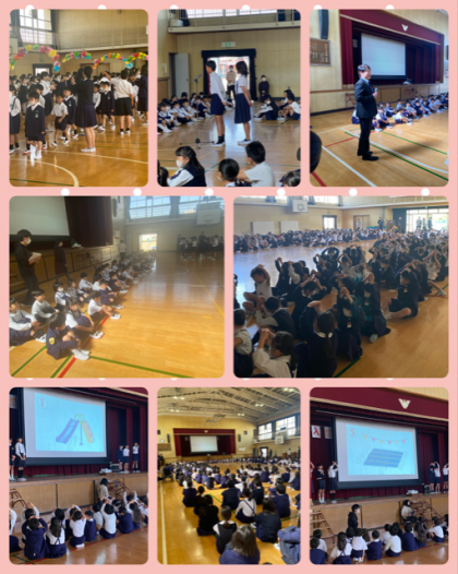 2年生以上の子どもたち全員とはじめましての1年生、ドキドキわくわくの集会が始まりました。
