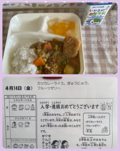 今日は、入学・進級お祝いこんだてです。1年生のごにゅうがくめでとうの気持ちと2年生以上のしんきゅうおめでとうの気持ちがこめられています。