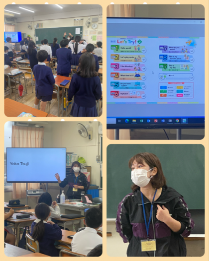 4年2組は、英語の学習です。昨年度に引き続き辻先生が授業をしてくださっています。ちなみに英語に親しむために指示や説明の言葉もできるだけ簡単な英語で授業をなさっています。