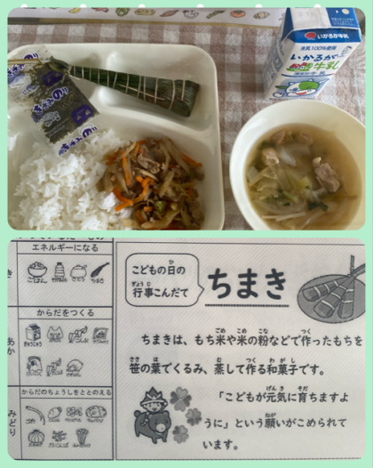 来週から、五月がスタートしますね。こどもの日ももうすぐです。今日は、こどもの日の行事献立で、ちらしに、ちまきが出ています。ちまきは、米粉やもち米で作ったほんのり甘いもちを笹の葉でくるんで蒸して作っている和菓子です。