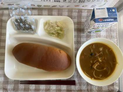 今日は大好きなカレー味の献立です。スパゲッティにたっぷりのカレースープがからんで、とっても美味しかったです。いろんな具が入ってボリューム満点でした。対照的にキャベツのピクルスがさっぱりしていて、味のバランスもばっちり!