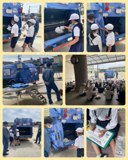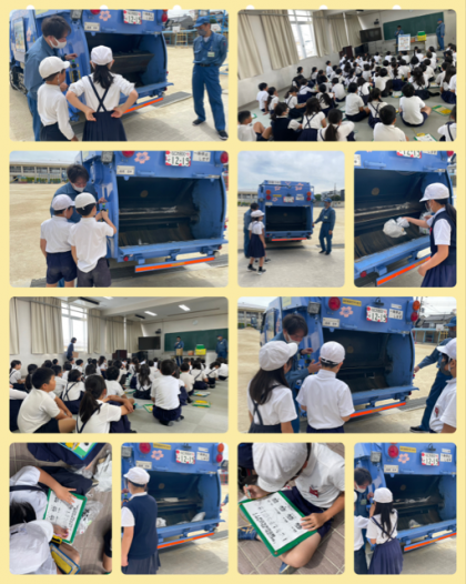 4年生の社会科では、わたしたちが住んでいる大阪府について学び、「健康なくらしとまちづくり」という単元の学習の中で、ゴミの問題について考えていきます。今日は、ゴミを回収するパッカー車に来てもらい、ゴミを回収する方法やパッカー車の仕組みを教えていただきます。袋に入れた紙ごみを、パッカー車の中に入れて、どうなっていくのか、観察中です。(@_@)