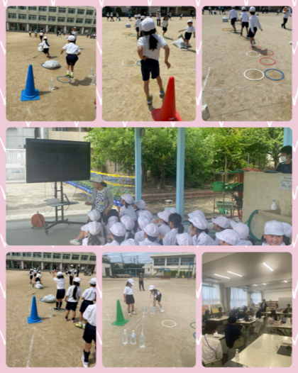 子どもたちがリズムよく跳ぶ楽しさを味わえるよう、ケンパーリングや大繩、ゴム跳びセット、ゴミ袋で作った岩等を用紙してくださいました。それらを使ったとびっこランドというコースをそれぞれのグループで作り、サーキット活動を行うという楽しそうな流れです。