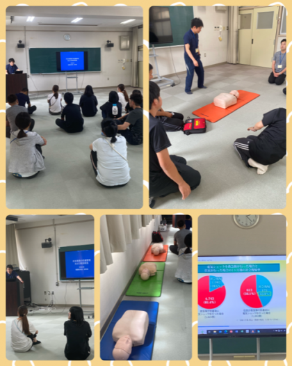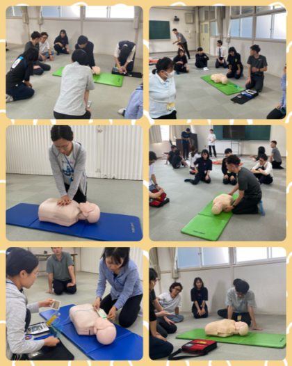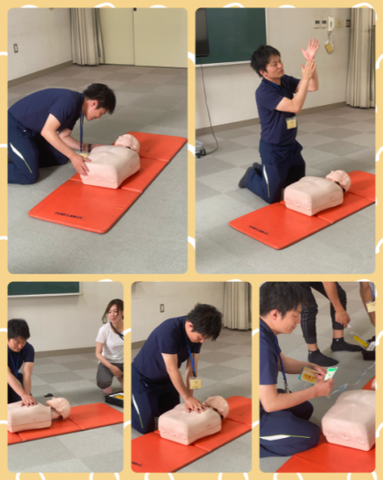 意識の確認の呼びかけや呼吸の確認、周囲への連絡、そして胸骨圧迫、人工呼吸、AEDと、みんな順に実際にやってみます。