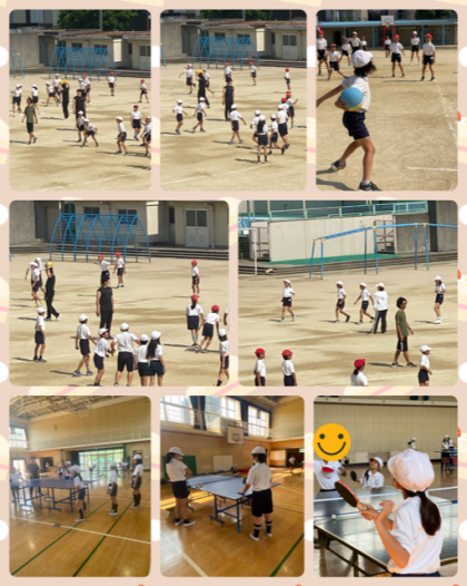1枚目は、屋外スポーツクラブと屋内スポーツクラブの様子です。屋外はドッジボール、屋内は卓球に挑戦。運動クラブの子どもたち、暑い中でも元気に走り回っています。