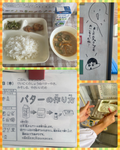 給食のサンプルを写真に撮ろうとしたら、給食委員会の子が上手な絵を描いていたので、パチリ!給食LOVEの子たち、指ハートまでもらいました。