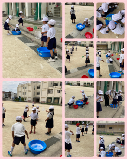 少し曇りの昨日、1年生は、シャボン玉遊びをしました。
