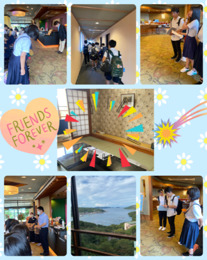 「きれい〜(@_@)」と窓からの景色に感動しています。早速、この後の避難訓練までに1組は入浴の用意、2組はお土産タイムの準備です!