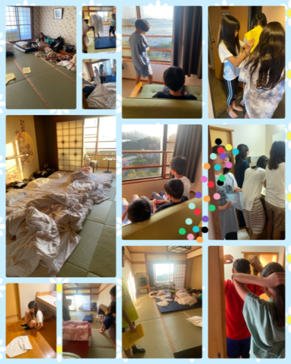 「5分前集合です!」とくぎをさされたせいか…朝の集いの集合はとてもスムーズです。軽く体操をして、朝食が待ってまーす!