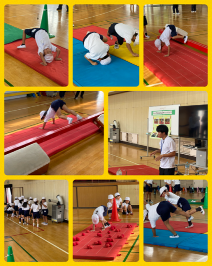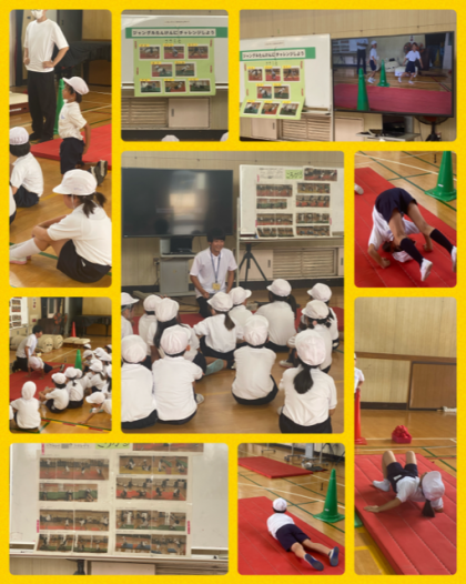 低学年は、マット運動ではなくマット運動遊びといって、遊びながら経験し、様々な動きを身につけていきます。