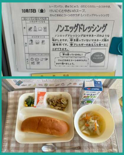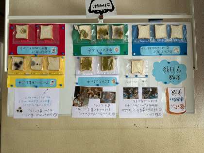今日はレーズンパンでした。みんな美味しそうにパンを手でちぎって食べていました。手で食べるパンですが、保健室前に健康教育委員会による興味深い実験の結果が掲示されています。石鹸で手を洗い、清潔なハンカチでふいた手で触った食パンと、水だけで洗った手やよごれたままの手で触った食パンを、密閉した袋に入れておいて変化を調べています。雑菌がついた食パンはカビがどんどん増殖していました…。手洗いの大切さがよくわかる実験です、みんな一層手洗いをしっかりしていくでしょうね。