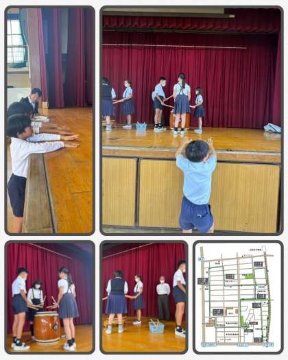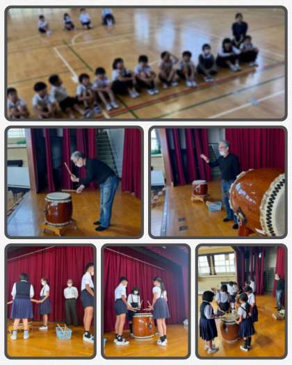 講堂で、太鼓の練習に励む3〜6年生の姿がありました。