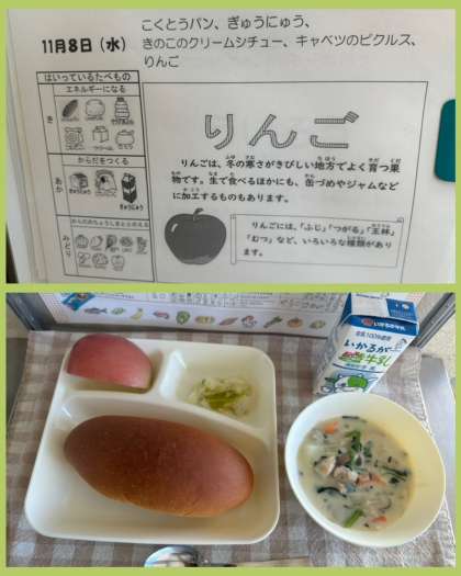 給食ではりんごが登場しました。まだまだ暖かい日もありますが、りんごが出てくると冬の訪れを感じます。