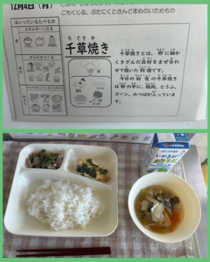 千草焼は、卵に細かく刻んだ具材をまぜ合わせて焼いた料理ですが、名前の由来は、まるで千種類もの具が入っているかのようにたくさんの具が入っているということだそうです。給食で出た千草焼の中には、鶏肉、豆腐、コーン、みつばがたくさん入って色々な味がしてとても美味しかったです。