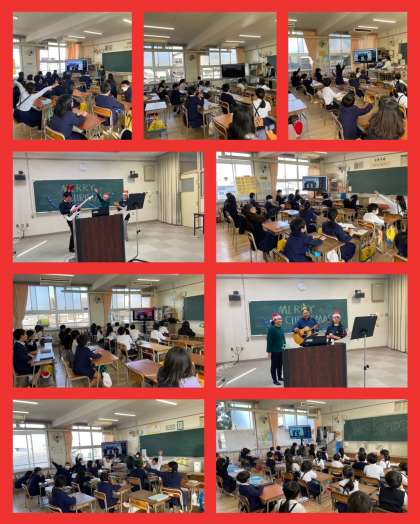 今日はスペシャルゲストとして、校長先生と谷先生が登場しました!エレキギターとアコースティックギターでそれぞれクリスマスソングを弾いてくださり、教室ではみんなが楽しく歌って大盛り上がり!