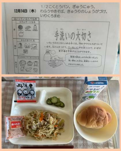 給食カレンダーに手洗いの大切さについて書かれていました。以前、健康給食委員会が食パンを使ってばい菌の繁殖具合を実験していましたが、手洗いのをしていない手は本当に汚れや菌だらけです。ただ洗うだけでなく、石鹸を使ってしっかりと洗うことが大切です。パンなど手を使って食べる献立の日は特にですね。