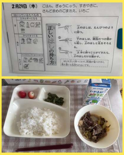 今日は正しい箸の持ち方について紹介がありました。「正しい箸の持ち方できていますか?」と聞くと、「見てみてー!わたしが1番上手ー!」と、みなが得意げに持ち方を見せてくれました。正しい持ち方をすると、食べやすい上に見た目にも気持ちがよくていいですね。