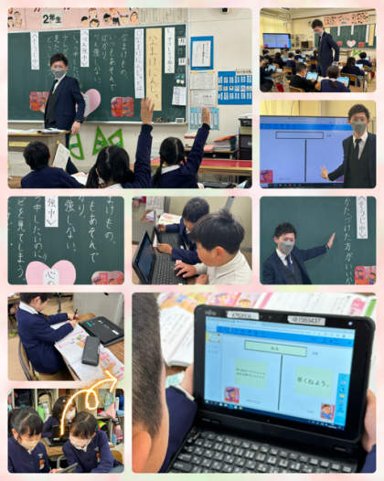 学習の最後は、タブレットを使って、なまけにんじゃが出てくる日常のいろいろな場面を想定して、立ち向かう言葉を書いて、みんなで共有します。タブレットもうまく使いこなしていて、校長先生も感心されていました。