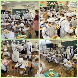 今日も1年生の教室では6年生がやさしく給食準備の仕方を教えてあげていました。1年生も実際に給食室までついていき、少しずつ自分たちでできるように練習しています。