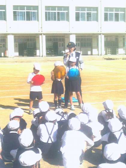 5日(木)に交通安全指導が行われました。東住吉警察の方と区役所ラビット隊のみなさんが、子どもたちに、わかりやすく丁寧に指導してくださいました。