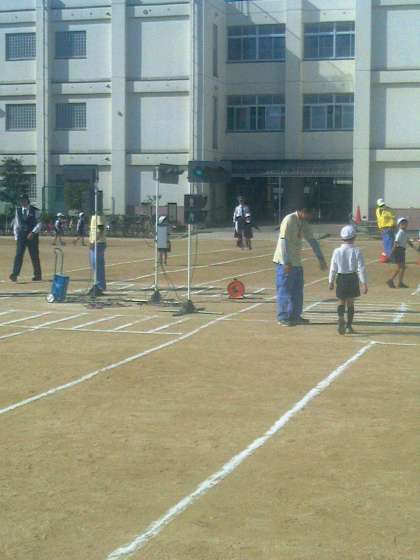 低学年は、「安全な歩き方」について学習しました。信号についての簡単な知識を学習した後、運動場に描いた道路の上を実際に歩く練習をしました。