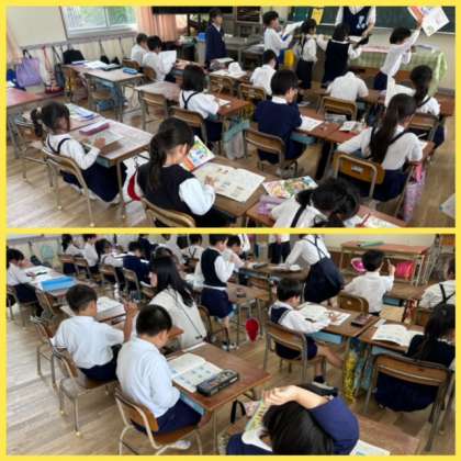 1年生が算数の学習をしていました。「6は2と何の数字を合わせた数でしょう?」というような問題に取り組んでいました。〇を書いて考えたり、指を使って考えたり、みんな集中して取り組めていました。