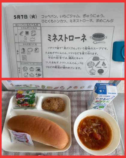 今日はミネストローネでした。ほどよいトマトの酸味が効いていてとても美味しかったです。ごちそうさまでした。