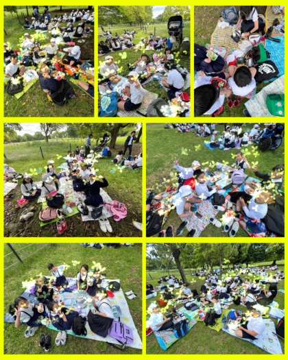 芝生の上にシートを広げて、みんな仲良く食べます。外で食べるご飯は、なんでこんなに美味しく感じるのでしょうか?みんなから笑顔があふれています^^